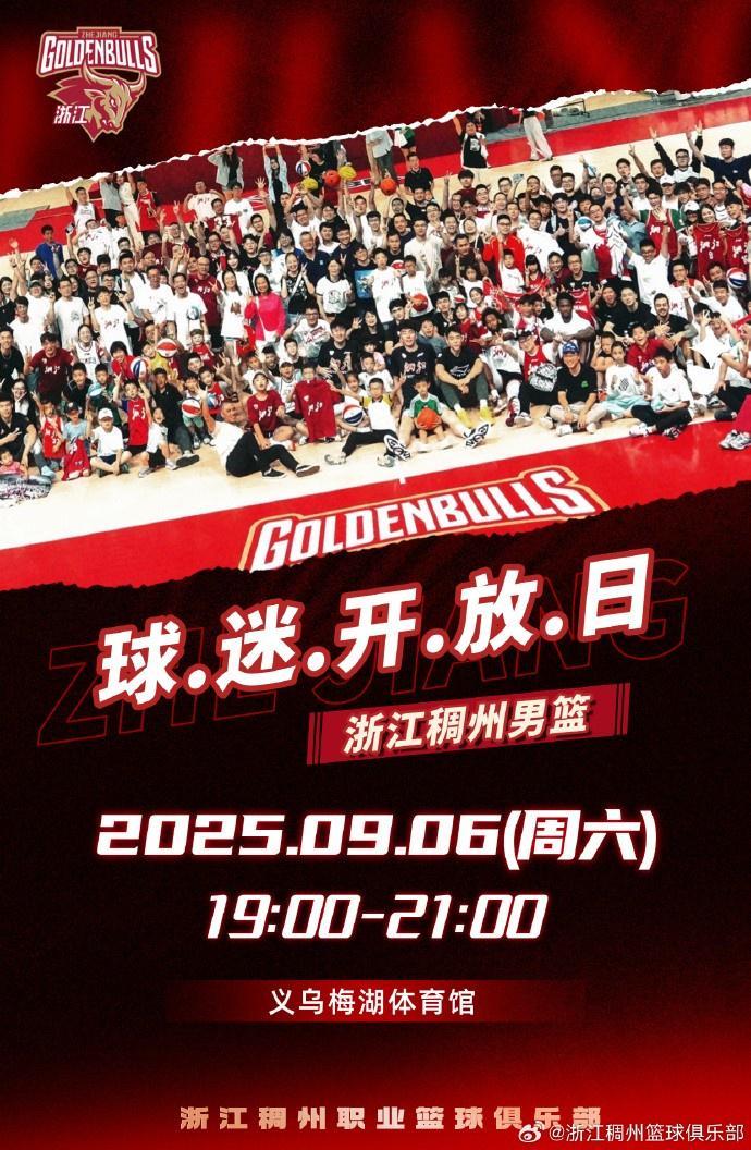 直播吧9月1日讯 浙江男篮今天在官方社媒上透露,球队新赛季主场回到义乌,并将于9月6日在义乌梅湖体育馆举办球迷开放日活动。